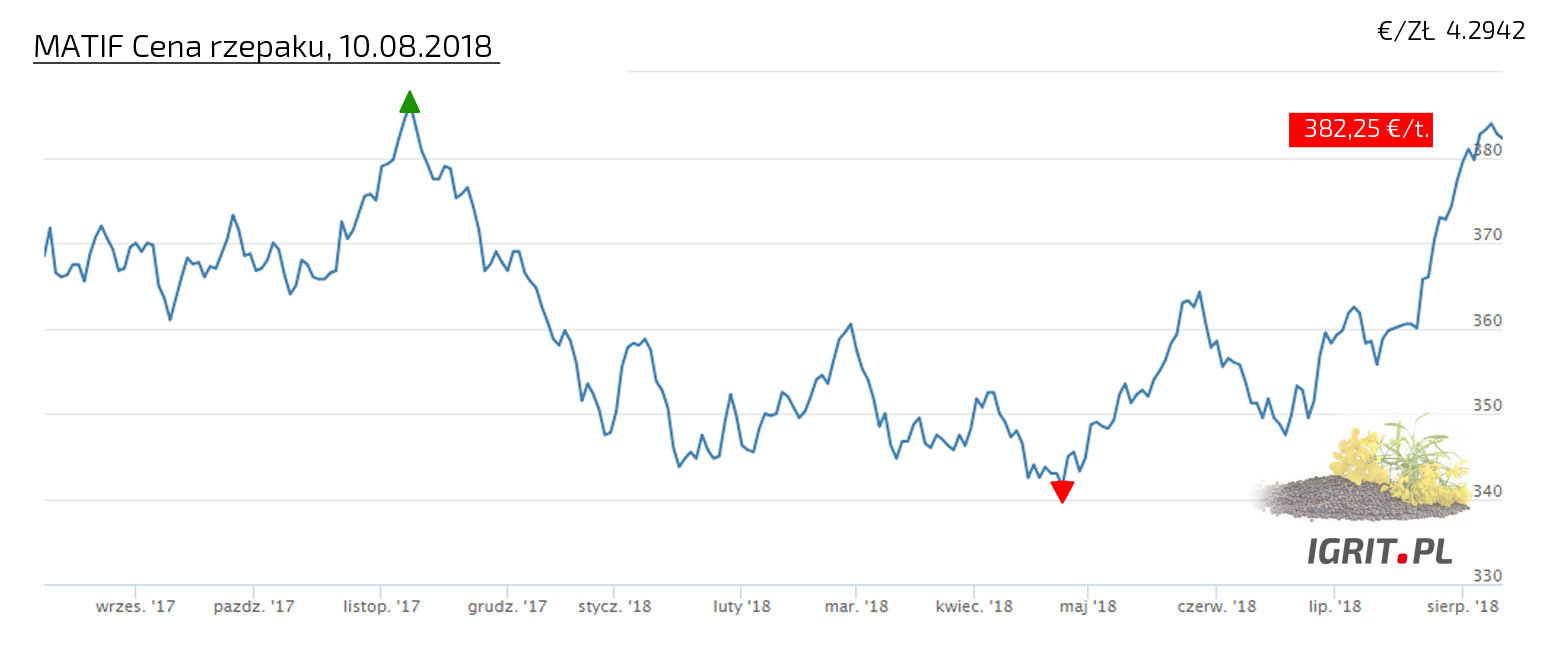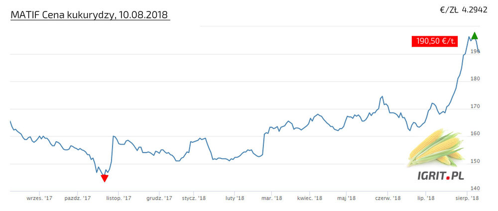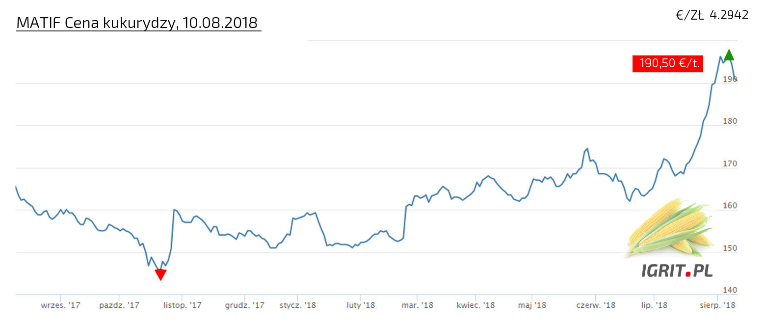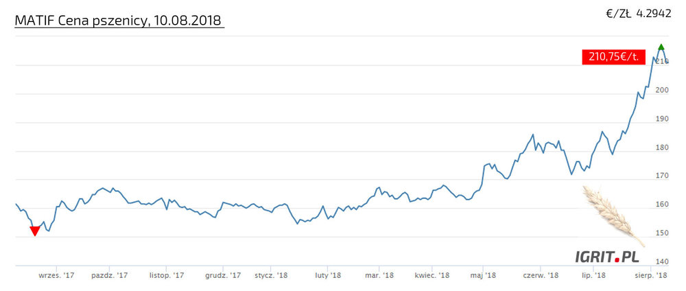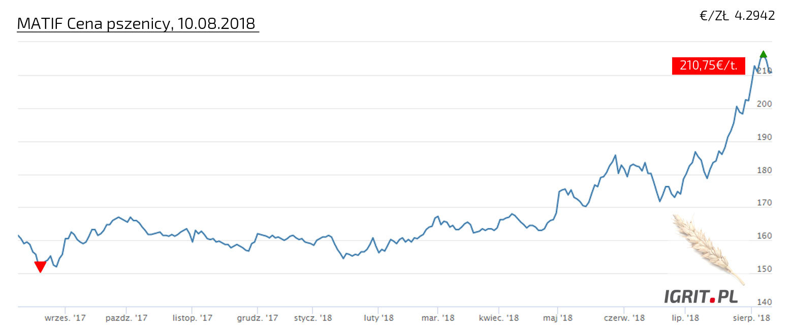Jeśli macie informacje nt. cen w punktach skupu, prosimy - informujcie w tym wątku. CENA PSZENICY USTANAWIA KOLEJNE REKORDY, 10 sierpień 2018! Pszenica konsumpcyjna na EURONEXT przebiła w ubiegłym tygodniu cenę 210 EUR/t w kontraktach na wrzesień, grudzień, marzec i maj. Takich cen już dawno nie było. A we wrześniu ubiegłego roku cena szybowała nieznacznie powyżej 150 EUR/t. Z pewnością, część tego wzrostu ceny można przypisać katastrofalnym skutkom zjawisk pogodowych w Europie (powodzenie na południu i zachodzie oraz susza w krajach północnej i środkowej Europy), które spowodowały znaczne obniżenie poziomu zbiorów (wg COPA COGECA o ok. 6%). Jadnak część analityków podejrzewa, że takie anomalie pogodowe są dobrą okazją do spekulacji, a zboża są wdzięcznym surowcem do spekulowania. W ślad za pszenicą podąża kukurydza, w przypadku której cena z około 130 EUR/t w końcu października 2017 wzrosła do 190,5 EUR/t, w ubiegły piątek. Takie ceny, jeśli się utrzymają, wpłyną z pewnością na ceny pasz i żywności.